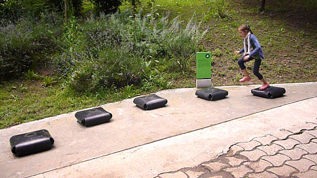 Encontraremos como una especie de "cojines" para ir saltando y crear, a su paso, diferentes sonidos; también podremos encontrar una explanada con diferentes instrumentos rudimentarios: con el movimiento, los niños podrán ver cómo se produce el sonido y las diferentes tonalidades.
