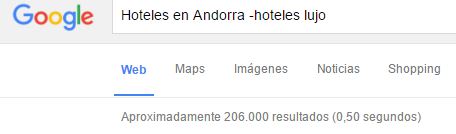 Búsqueda negativa o excluyente, guion medio. Esta herramienta es muy agradecida y poco conocida, porque podemos indicarle que excluya conceptos que son demasiados genéricos y que pueden tener muchos significados. Lo que le indicamos con el guion es que ignore la palabra que le indicamos poniendo el guion delante. Por ejemplo: receta salsa pasta –tomate; hotel en Barcelona –hotel familiar. Con estas búsquedas le estamos diciendo a Google que busque todo lo que tenga en salsa para la pasta excepto las salsas con tomate. O bien en el segundo ejemplo, le estamos diciendo que busque hotel en Barcelona pero que ignore los hoteles para familias.