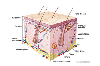 Anatomía de la piel. Muestra la epidermis, la dermis y el tejido subcutáneo.
